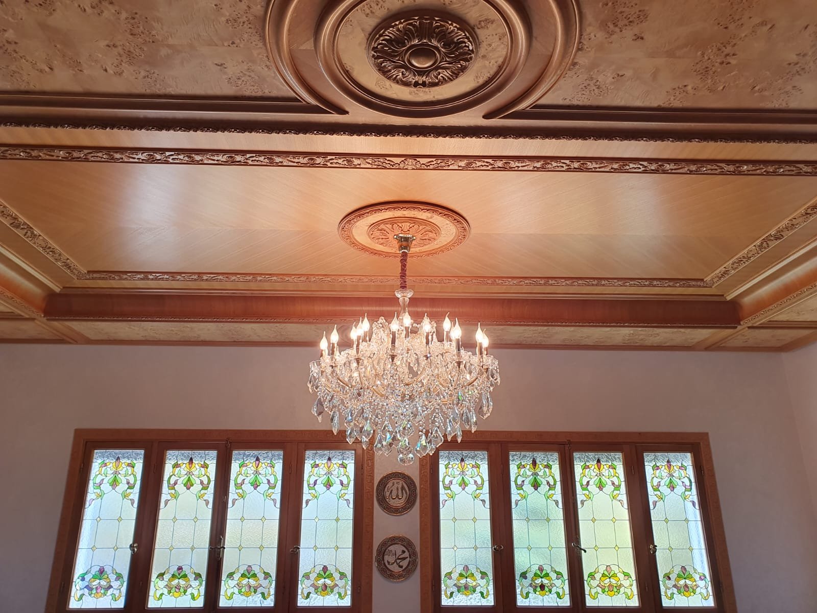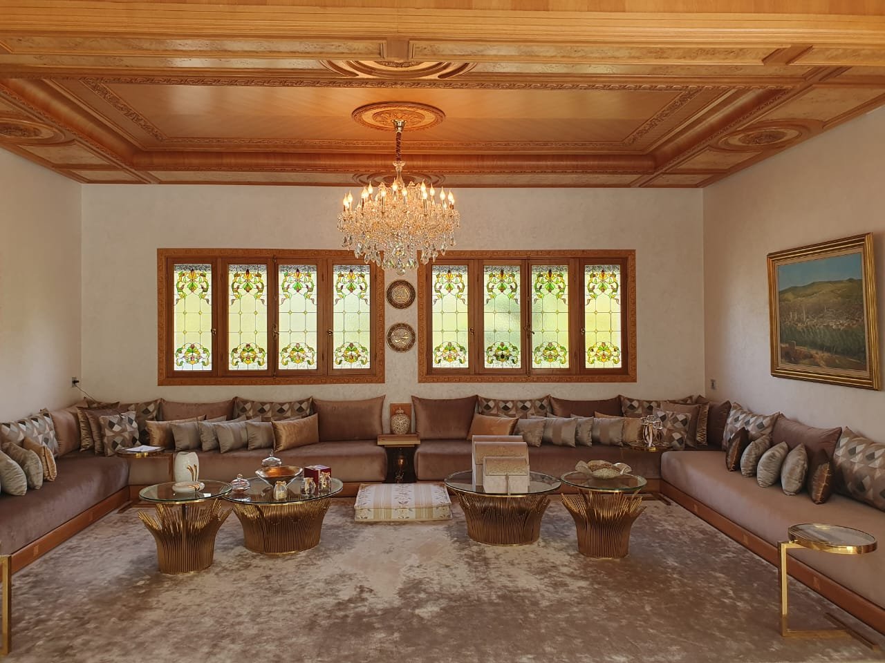 * Salon marocain avec son plafond de bois ouvragé et ses fenêtres en verre décoratif