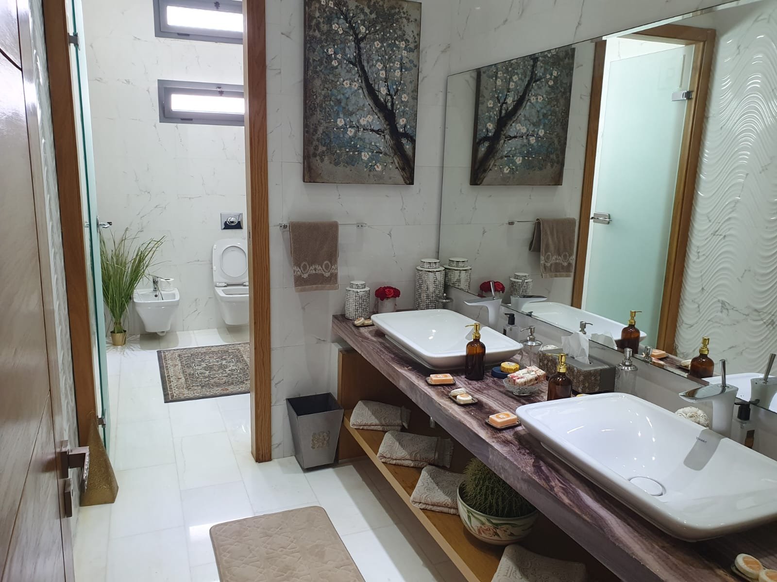 Le sol au rez de chaussée et le niveau inférieur est recouvert de marbre blanc du premier choix.