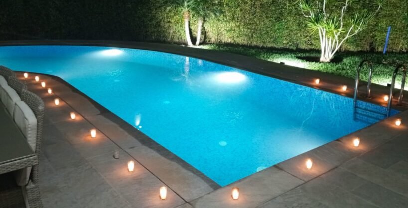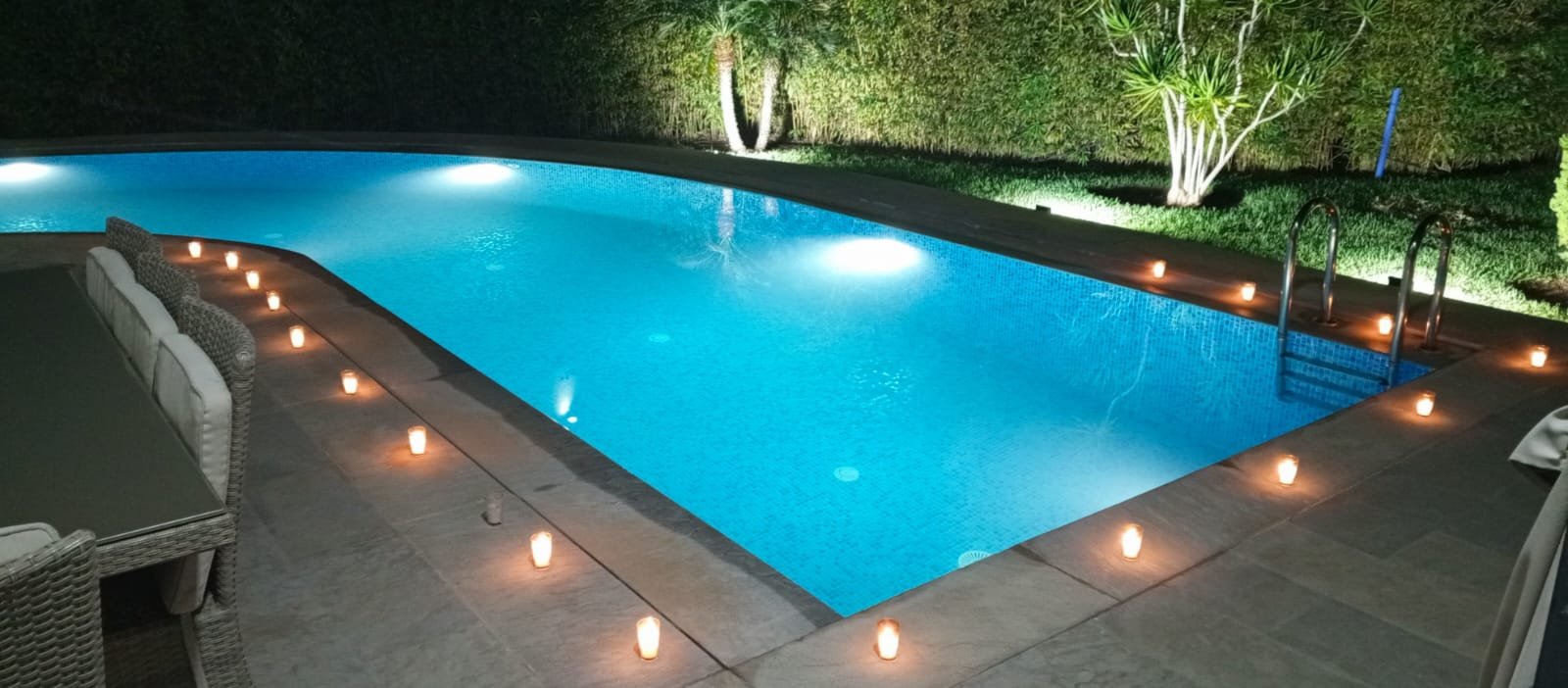 * Jardin paysagé avec une belle et grande piscine à débordement