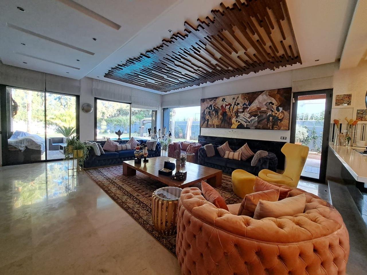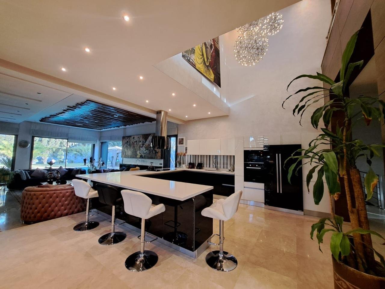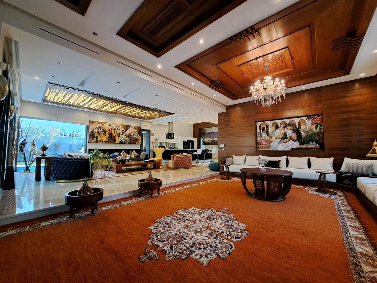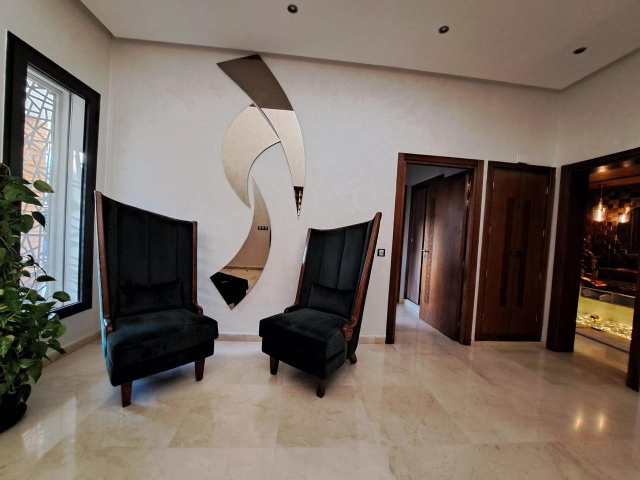 Dès l’entrée, un hall élégant mène vers de vastes espaces de réception comprenant un somptueux salon marocain plein de caractère et un salon européen lumineux, idéal pour recevoir ou profiter de moments en famille, ainsi qu’un bureau.
