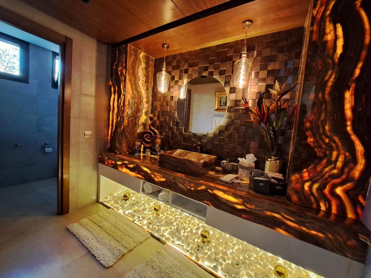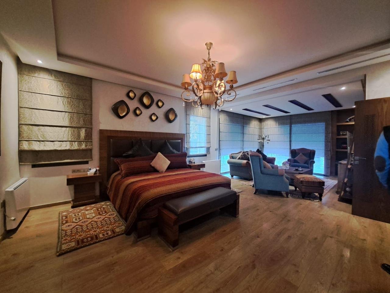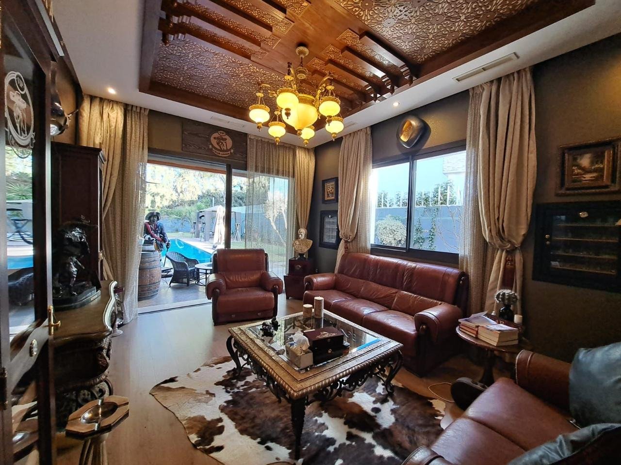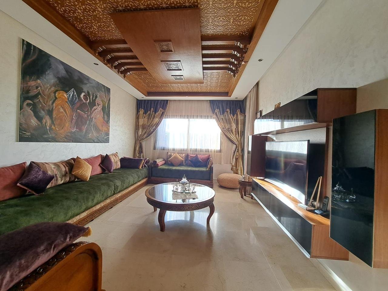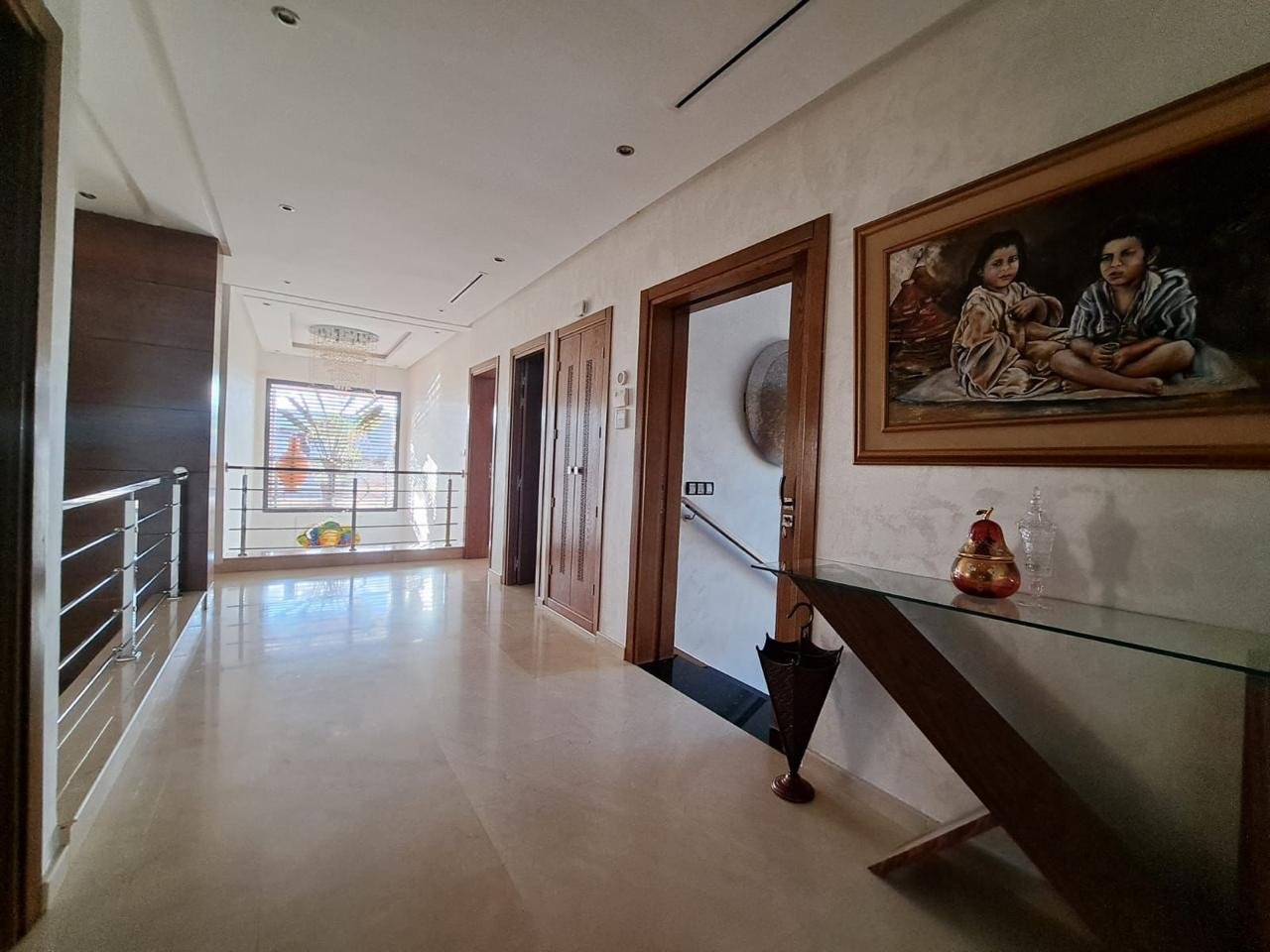 Dès l’entrée, un hall élégant mène vers de vastes espaces de réception comprenant un somptueux salon marocain plein de caractère et un salon européen lumineux, idéal pour recevoir ou profiter de moments en famille, ainsi qu’un bureau.